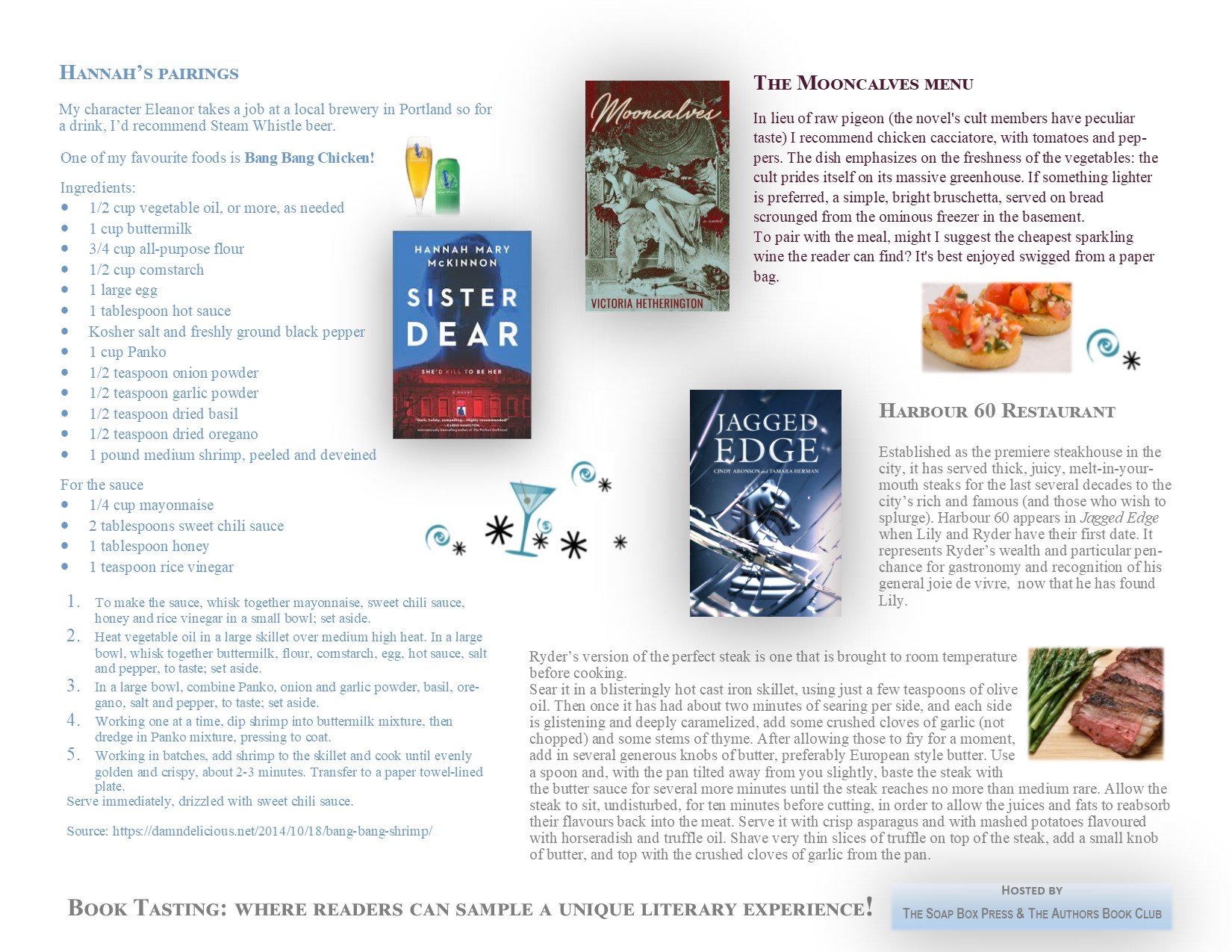 More than a year later, we continue to reimagine ways to connect readers with authors living and working in Canada. We have encouraged virtual book club meetings and tried new and creative ways to bring people together, including our first “Book Tasting Event” co-hosted with The Soap Box Press. Authors Hannah Mary McKinnon, Victoria Hetherington, Cindy Aronson and Tamara Herman recommended food and drinks to pair with their books. They met with guests in private virtual rooms for this highly interactive experience.