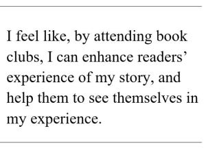 CHELSEA: Book clubs – whether in-person or virtual – provide an incredible form of support for an author. Is there a book club experience you had that you will never forget?